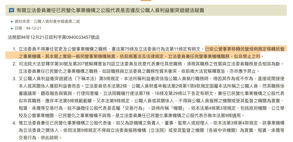 立法委員不得兼任:行政相關、立法相關、公營董總監