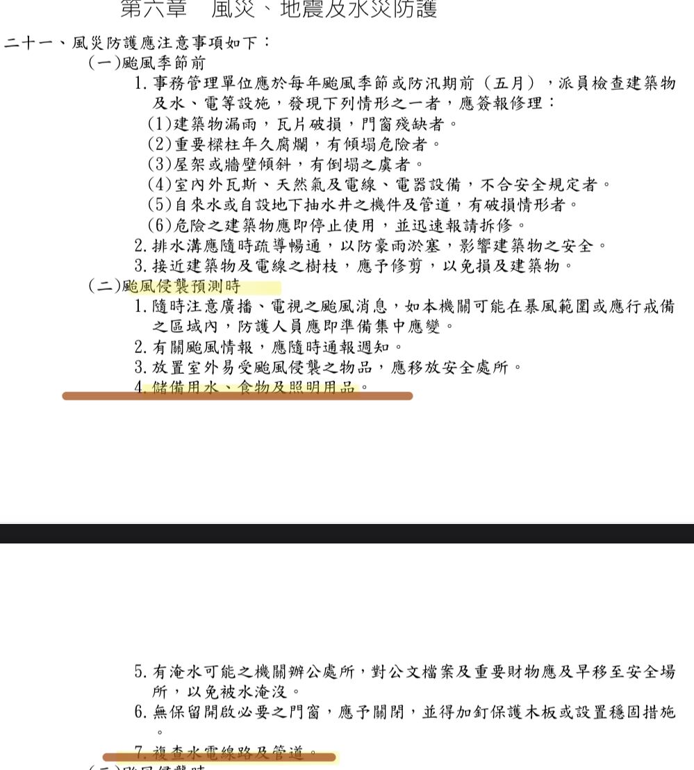 12.依據安全管理手冊規定,下列有關颱風侵襲預測時,應採行防護應注意事項之敘述,何者正確? A.複查水電線 路及管道 B.儲備用水、食物及照明用品 C.複檢門窗等處所,發現漏風(水)或損毀,應立即修補 D.清查財產損失, 列冊報請上級機關或有關機關查核