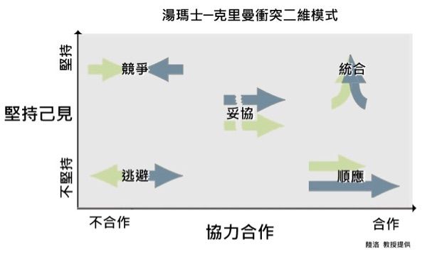 1.「競爭」(competing):堅持己見與不合作。採取競爭型策略的人,會堅守自己的立場,不願退讓分毫。這種衝突處理方式,可能會扼殺發展創意解決方案的機會,也特別容易損害雙方的關係,不利發展長期合作。