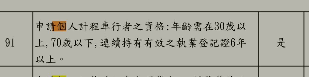 12. 申請個人計程車行者之資格:年齡需在30歲以上,70歲以下,連續持有有效之執業登記證6年以上。