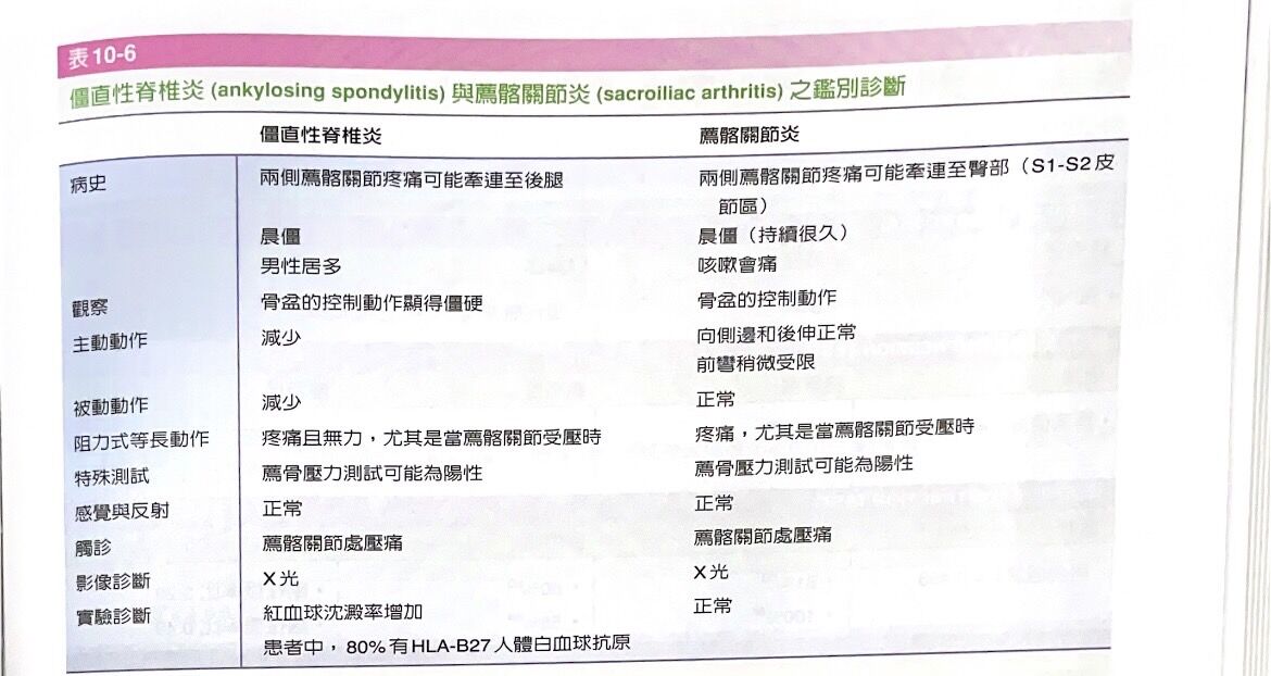 13.一名女性患者,主訴臀部、髂骨與薦骨區域之局部疼痛,早晨起床會有晨僵,咳嗽會誘發症狀,軀幹側彎和
