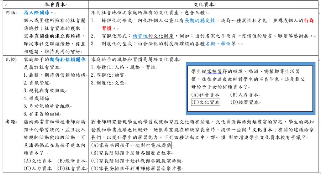 文化資本:指由知識、思考模式、行為習慣、價值體系或慣習等組成的形式。在某些條件下,能轉換成經濟資本,以教育文憑的形式被制度化的。