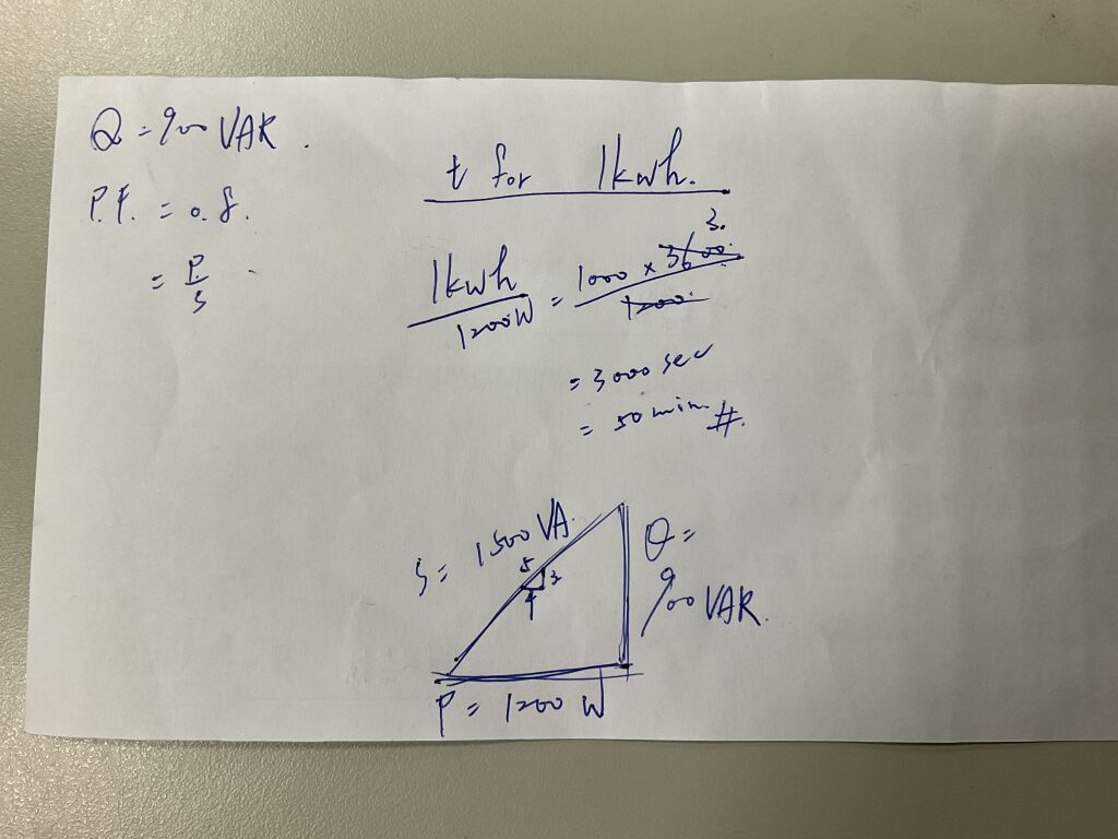 13. 一個交流電機設備在運轉時的無效功率為900 VAR,功率因數為0.8,請問運轉多久會
