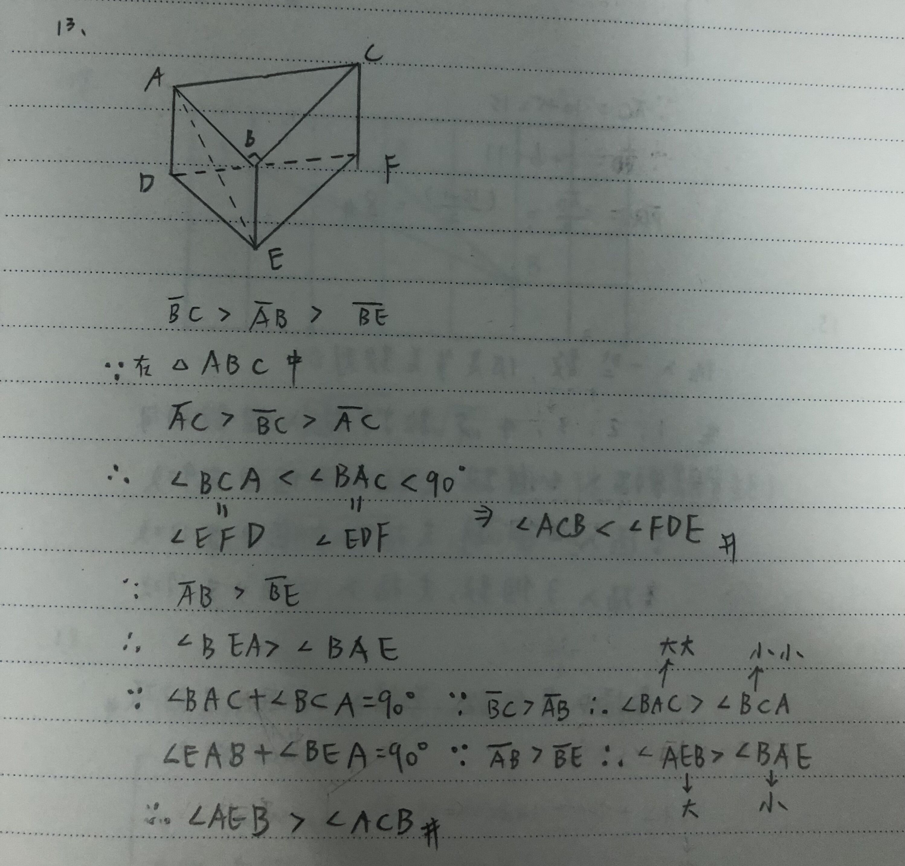 △ABE中,BC>BE, 因等AB且都是直角, ∠AEB>∠ACB。(把BE往BC上重疊即知)