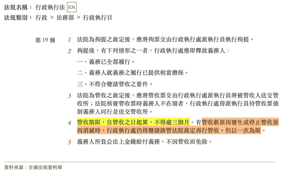 管收期限,自管收之日起算,不得逾三個月。有管收新原因發生或停止管收原因消滅時,行政執行處仍得聲請該管法院裁定再行管收。但以一次為限。