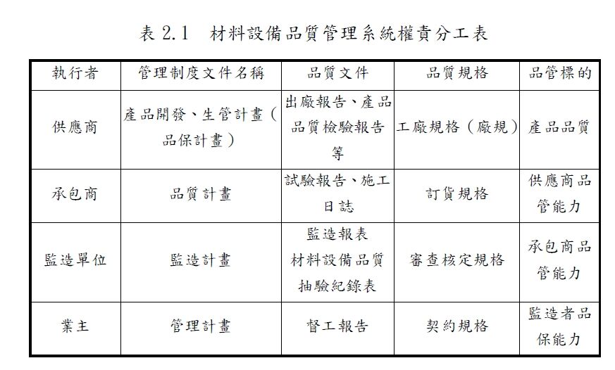 14. 在工程材料設備品管系統權責分工中,承包商之品管標的,是