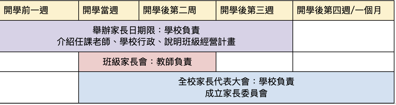 | 第六條 | 每學年開學後兩週內 | 導師 | 班級家長會(班級理念、選家長代表...) |