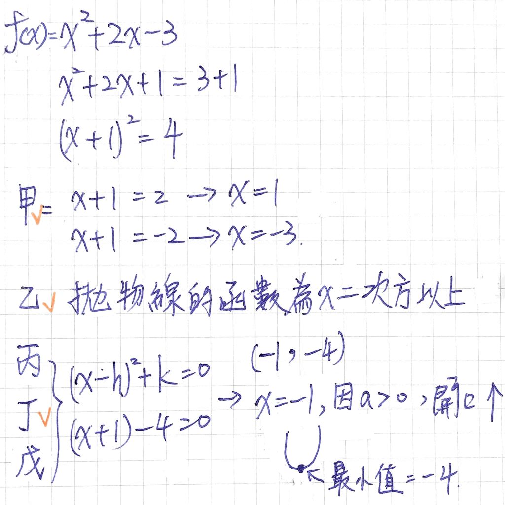 14.已知f(x)=x2+2x−3,請判斷下列哪些敘述是正確的?甲:f(x)=0有相異的兩根1和−3乙:y=f(x)的函數圖形為拋物線丙:在x=1時,f(x)有最小值4丁:在x=−1時,f(x)有最小值−4戊:在x=1時,f(x)有最大值4