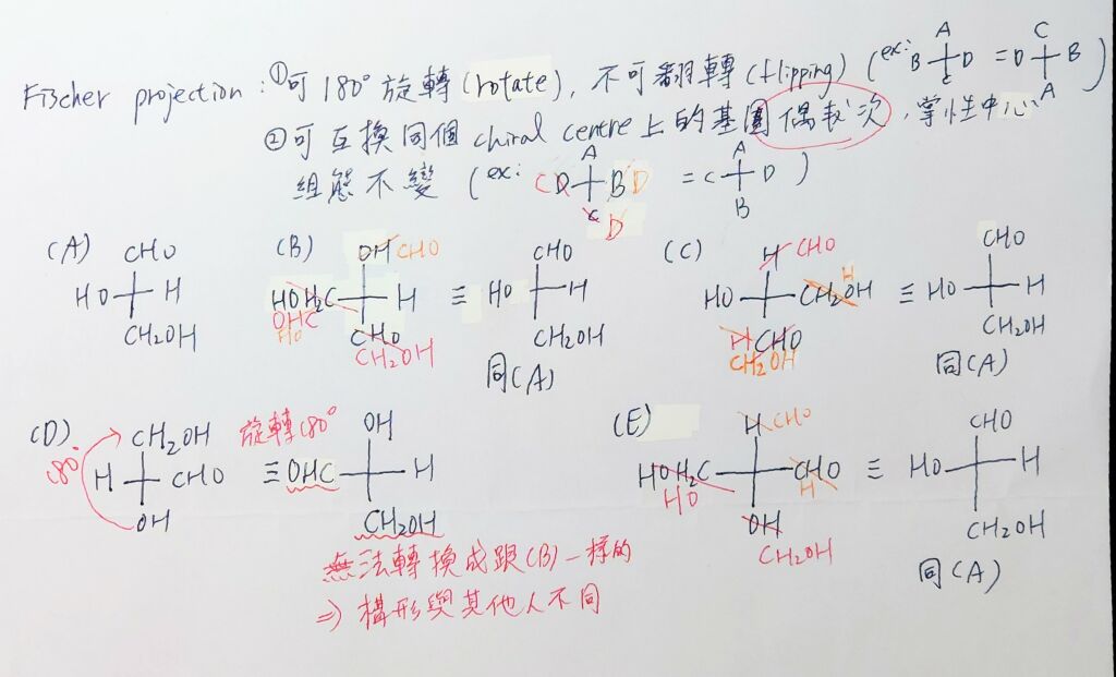 14. 根據費雪投影式(Fischer projection),下列掌性分子中,何者立體組態(stereoconfiguration)與其它分子相異?