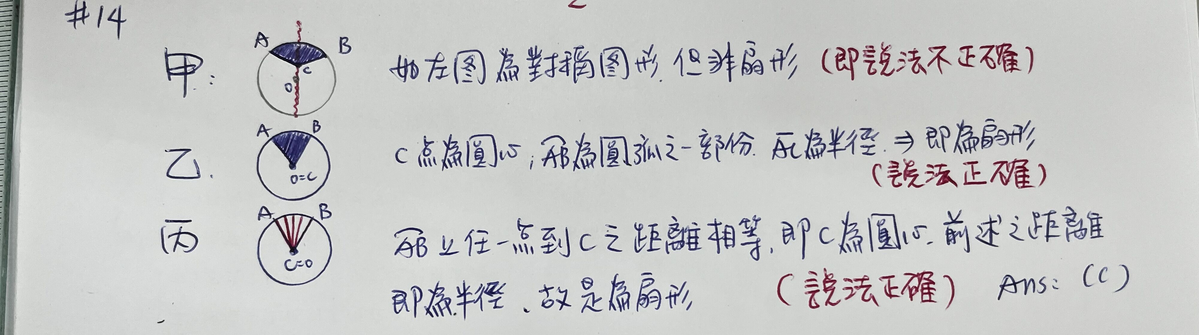 14. 老師拿出一個圖形卡,如圖,想請學生確認該圖形是否為一個扇形? 有三位學生的說法如下: 甲、把圖形對摺(A、B兩點重合),如果對摺後圖形完全疊合,則此圖形為扇形。 乙、拿圓規以C為圓心,