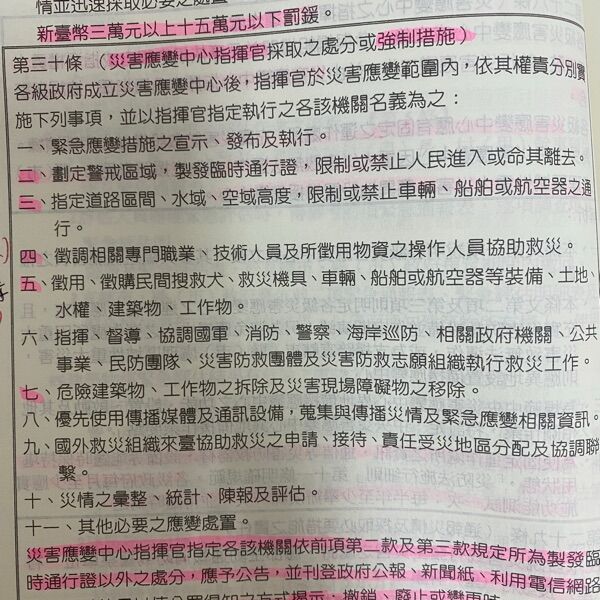 - 徵用、徵購民間搜救犬、救災機具、車輛、船舶或航空器等裝備、土地、水權、建築物、工作物 。