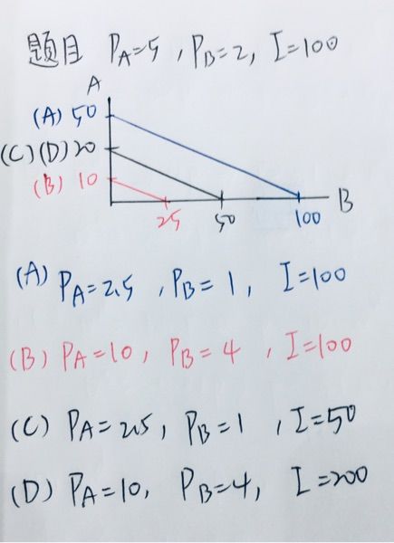 15 給定某一消費者的所得 I 為 100 元,其消費 A 與 B 兩種產品,價格分別為 PA=5 及 PB=2。下列何者會讓 此一消費者之預算限制線平行外移?