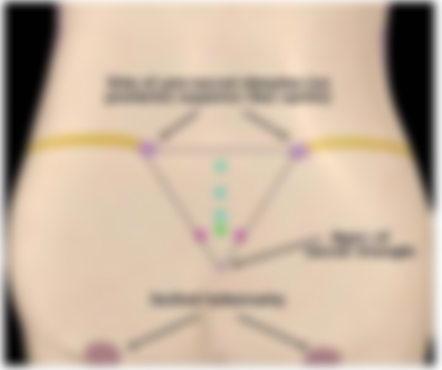 (B)薦三角(sacral triangle)的底是腸骨後上棘(posterosuperior iliac spine)的連線