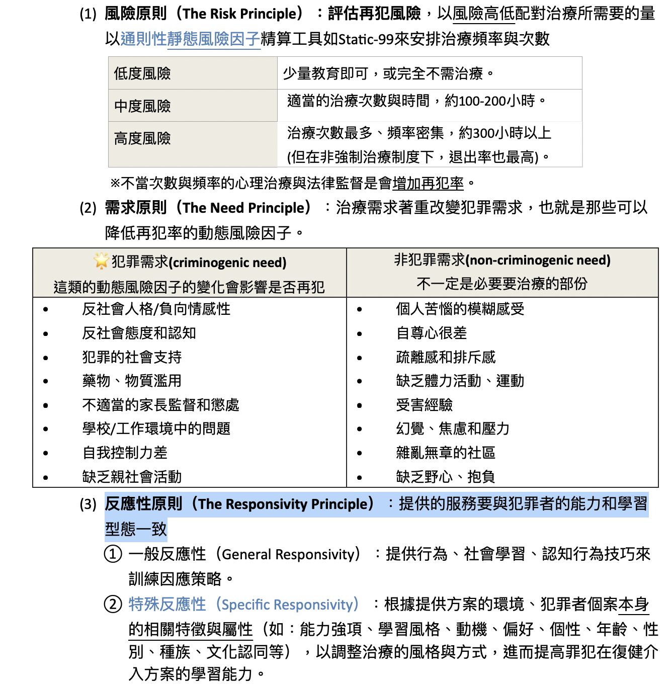 - 需求原則(The Need Principle):治療需求著重改變犯罪需求,也就是那些可以降低再犯率的動態風險因子