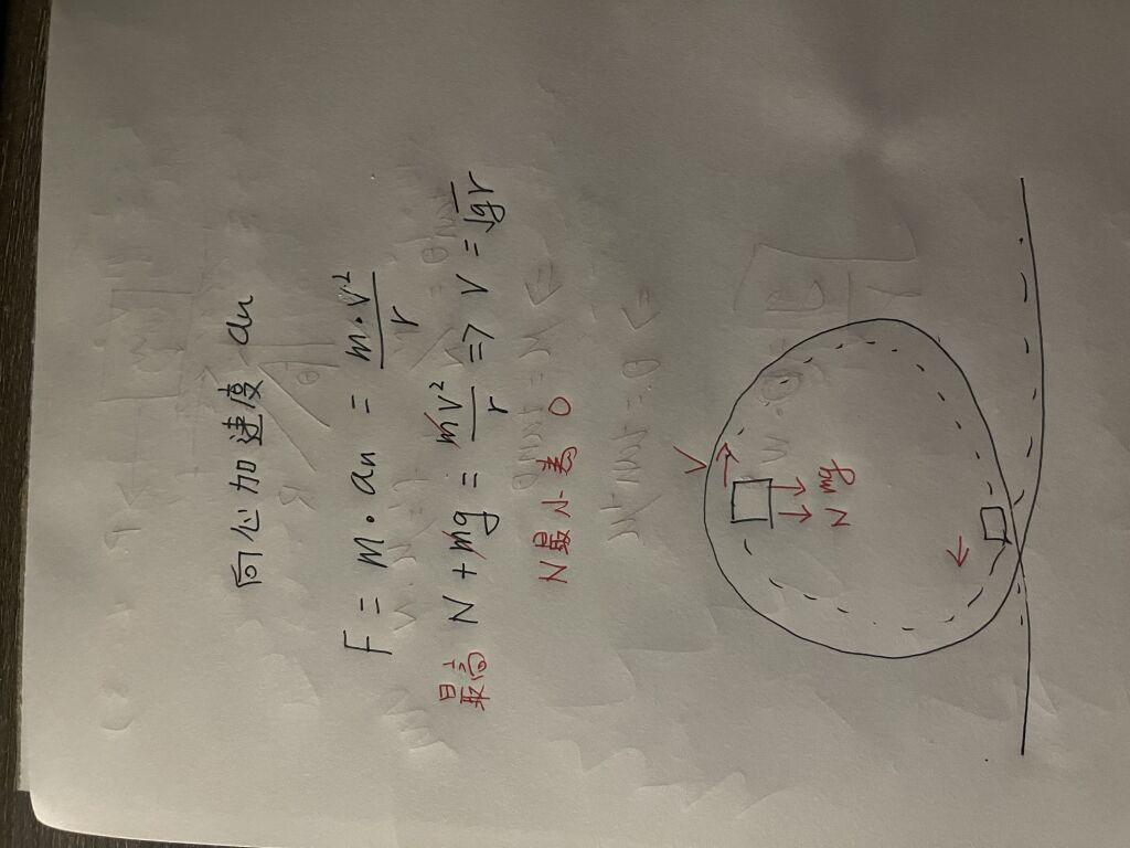 15.有一遊樂園之雲霄飛車在一垂直的圓形軌道內側滑行,軌道半徑為 r,則為保持飛車與軌道間有正向之接觸力,在 軌道之最高點的車速至少應為多少?(重力加速度為 g)