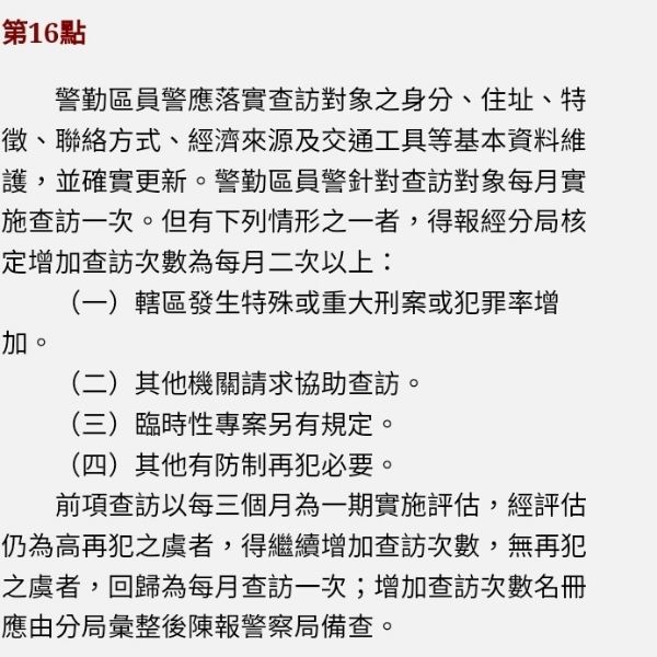 15. 依據警政署 93﹒04﹒20 訂頒「治安顧慮人口查訪作業規定」,有關實施查訪防制再犯,查訪對象每個月