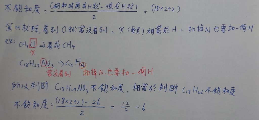 15. 辣椒素(capsaicin)的分子式是 C18H27NO3,試問它的不飽和度(degree of unsaturation)等於多少?
