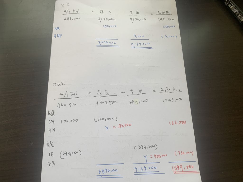 4月底正確餘額= 186,500+(8,120,000+250,000)-(7,150,000+7,000)=1,399,500