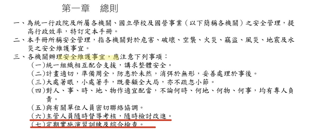 主規劃管理,講求各單位之分工合作 B.防患於未然,消弭於無形,妥善處理於事後 C.主管人員每季辦理督導考核,