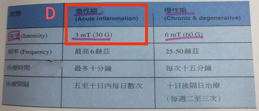(D)在急性期時建議使用3毫特斯拉(mT)相當於30高斯的治療強度