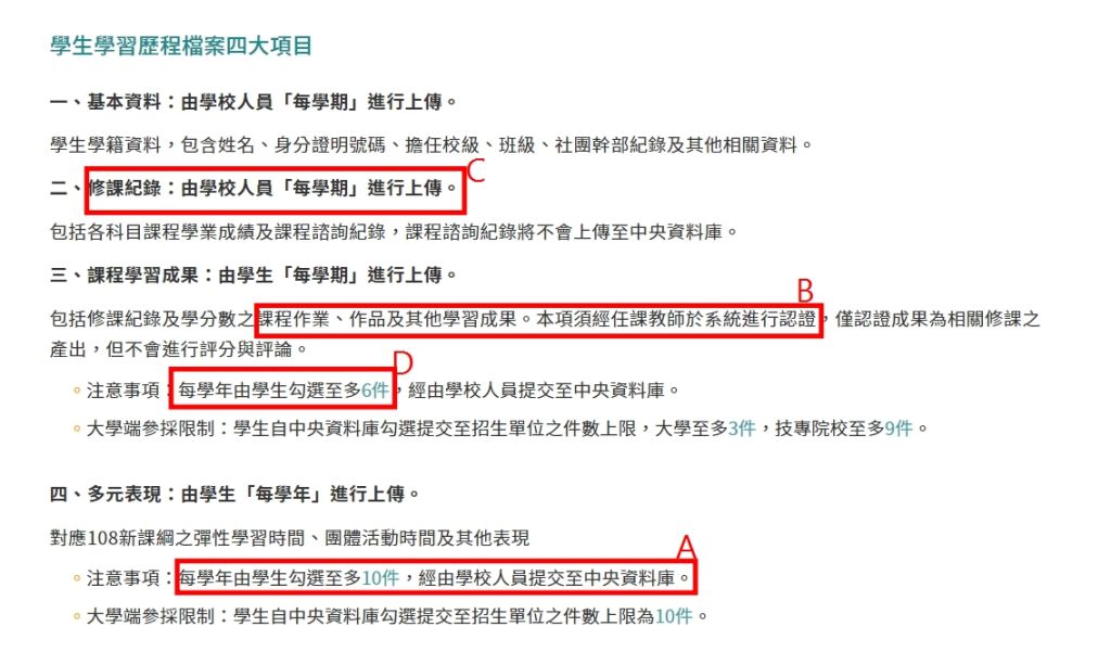 (D) 課程學習成果每學年由學生勾選至少 6 件,由學校人員提交至中央資料庫