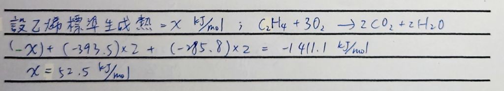 之標準生 成熱為-285.8 kJ/mol,則乙烯之標準生成熱(∆Hf, kJ/mol)為何?