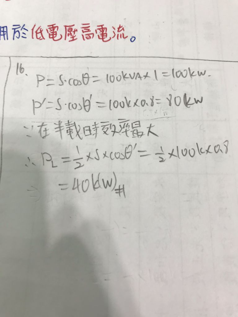 16. 某一額定輸出100 kVA之單相變壓器,供給一功率因數為1.0之負載,於半載時效率最大,今