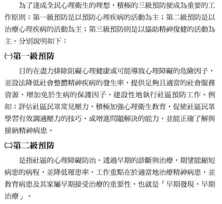 次級預防針對「有心理困擾但非確診的精神疾病患者」,重點為早期發現與介入