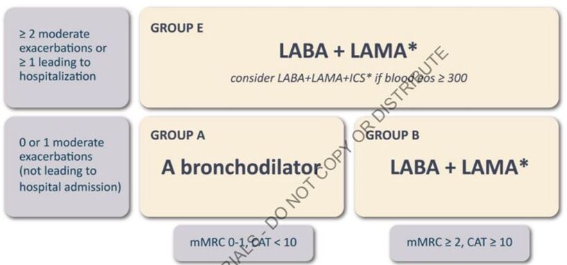 17.依照 GOLD 指引,下列何種吸入劑最適合慢性阻塞性肺疾病 Group D 病人使用?