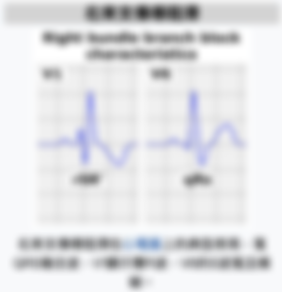 *RR’:無論在左側還是右側束支傳導阻滯中,心室激動非同步進行:阻滯一側的心室去極化延遲。這一延遲引起阻滯心室產生的QRS波群寬度大於正常,且位於非阻滯心室產生的QRS波群之後。因此,複合的QRS波群寬度≥120ms且存在RSR’波:R波屬於非阻滯心室產生的QRS波群,R’波則屬於阻滯心室產生的QRS波群。