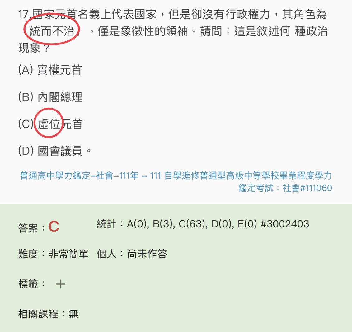 17.國家元首名義上代表國家,但是卻沒有行政權力,其角色為「統而不治」,僅是象徵性的領袖。請問:這是敘述何 種政治現象?
