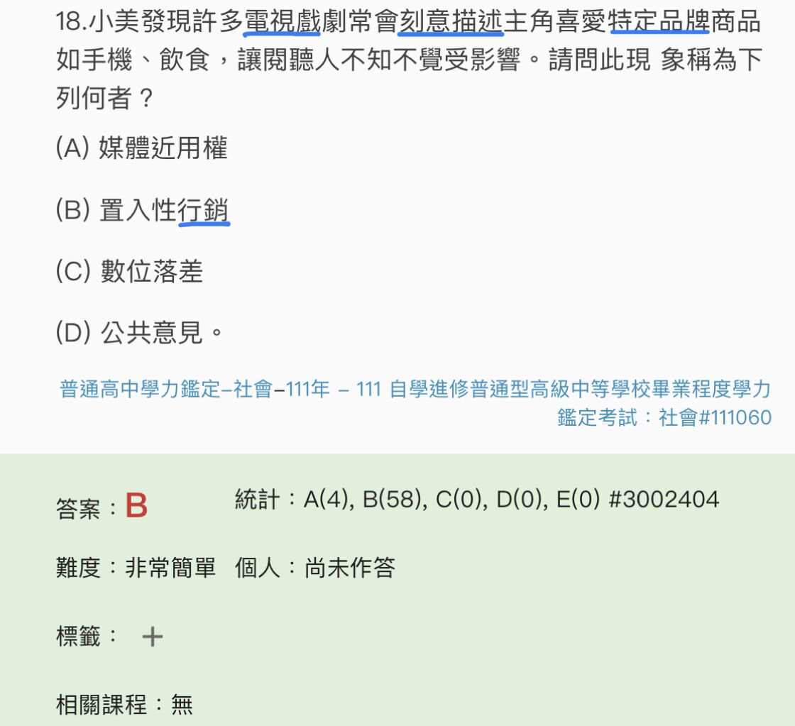18.小美發現許多電視戲劇常會刻意描述主角喜愛特定品牌商品如手機、飲食,讓閱聽人不知不覺受影響。請問此現 象稱為下列何者?