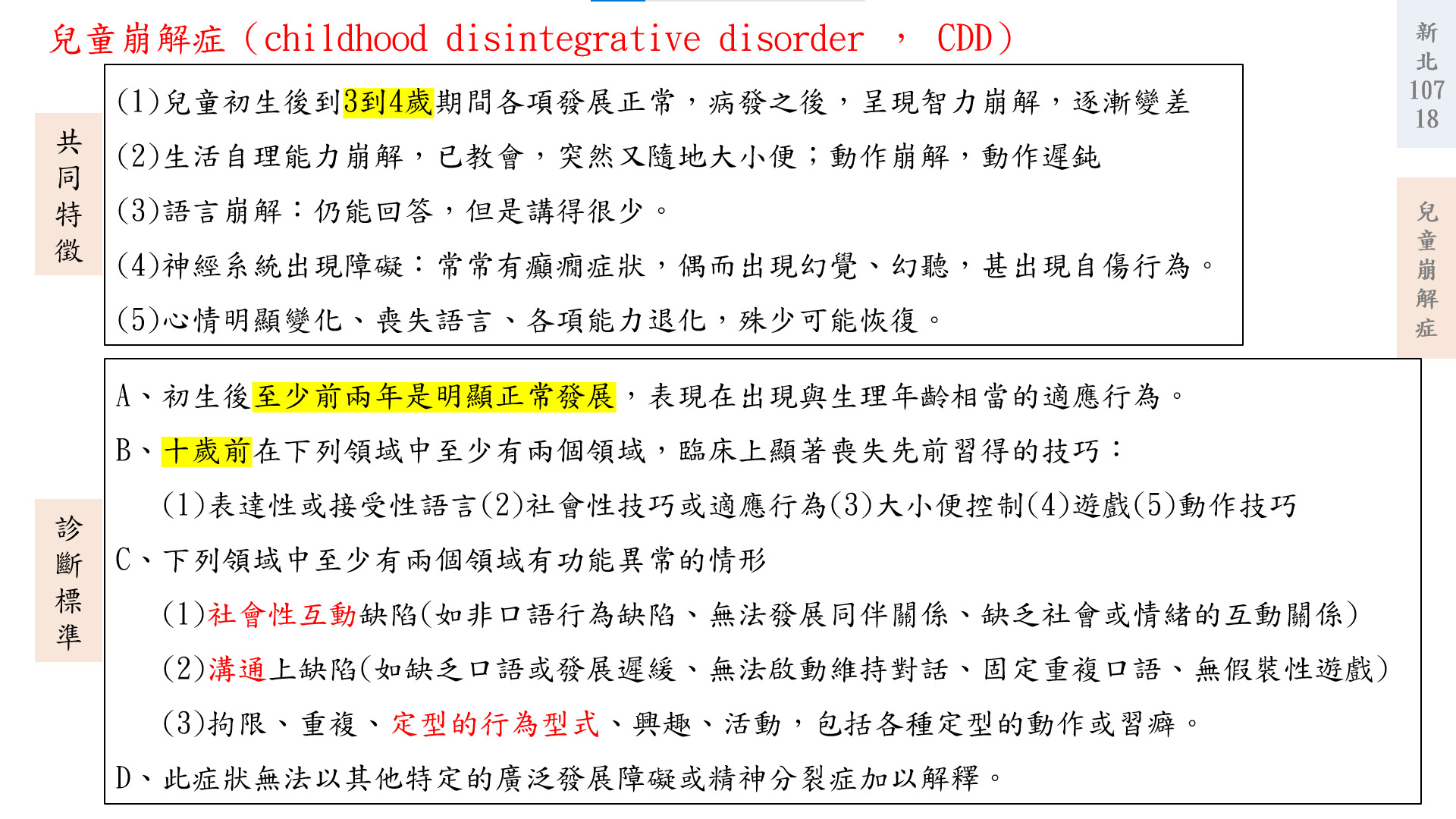 美國精神醫學學會精神疾病診斷與統計手冊第四版 (DSM-IV) (American Psychiatric Association, 1994)兒童期崩解症的診斷標準如下: