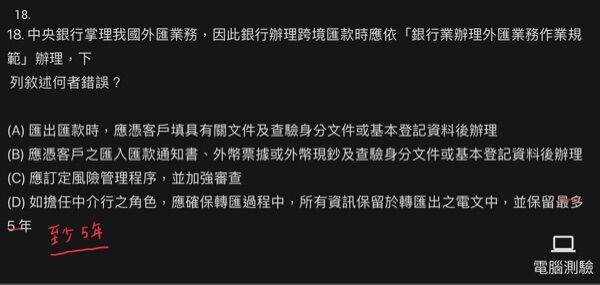 18. 中央銀行掌理我國外匯業務,因此銀行辦理跨境匯款時應依「銀行業辦理外匯業務作業規範」辦理,下
