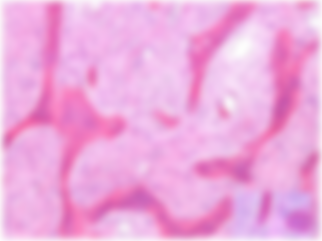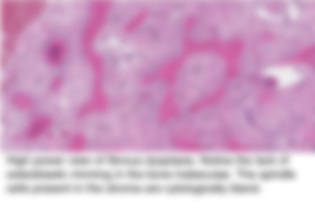 18. 45歲女性,左上顎無牙區有無痛的腫塊且表面黏膜完整,X光影像呈現毛玻璃樣(ground-glass)的變化,病 灶鏡下呈現如下圖。則此病變最可能為下列何者?