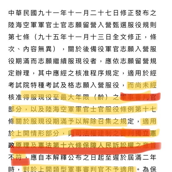 軍法官不會因為是軍人就有最大服役年限問題 然如同法官身分之保障與一般公務員不同,軍事審判官身分之保障亦應有別於一般軍官。