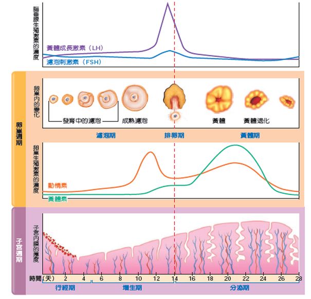 濾泡期早期 月經期 FSH、LH皆低 E2、P 皆低濾泡期晚期 增值期 FSH 增加 E2 開始上升 至最高點時排卵