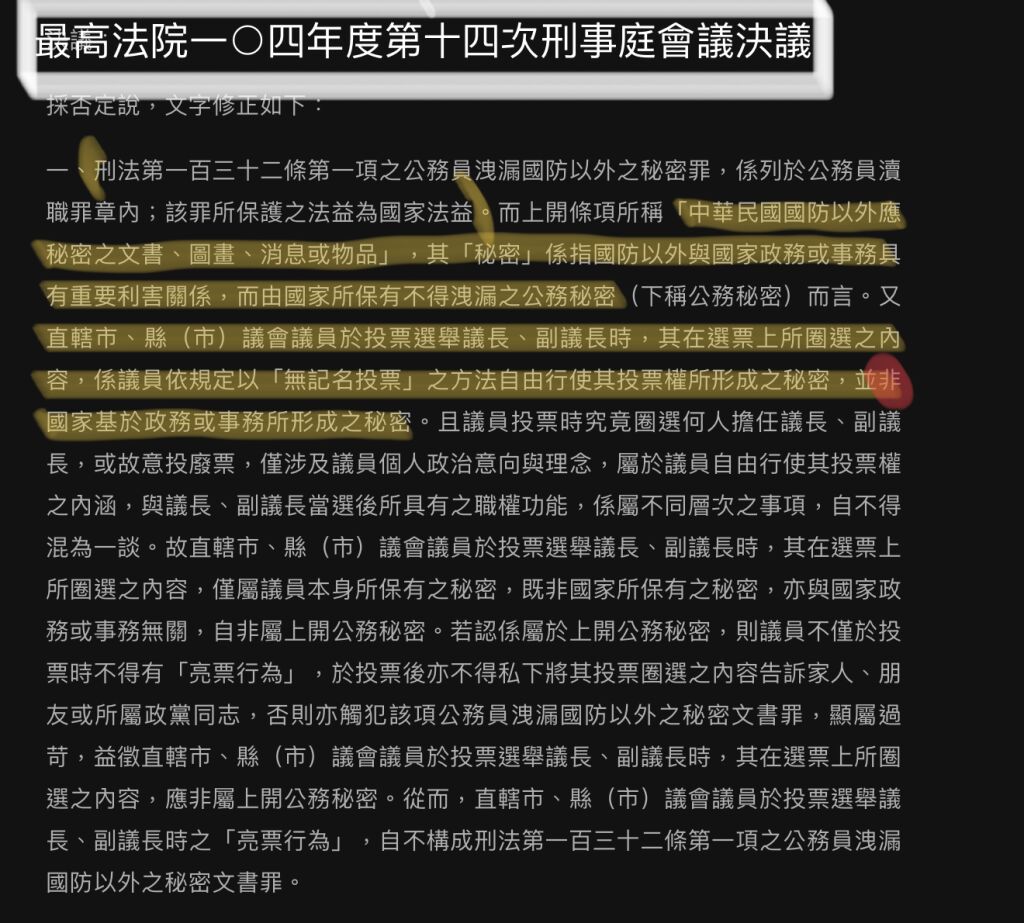 最高法院9月1日召開第14次刑事庭會議,就直轄市、縣(市)議會議員於投票選舉議長、副議長時之「亮票行為」作成決議。決議內容略以:
