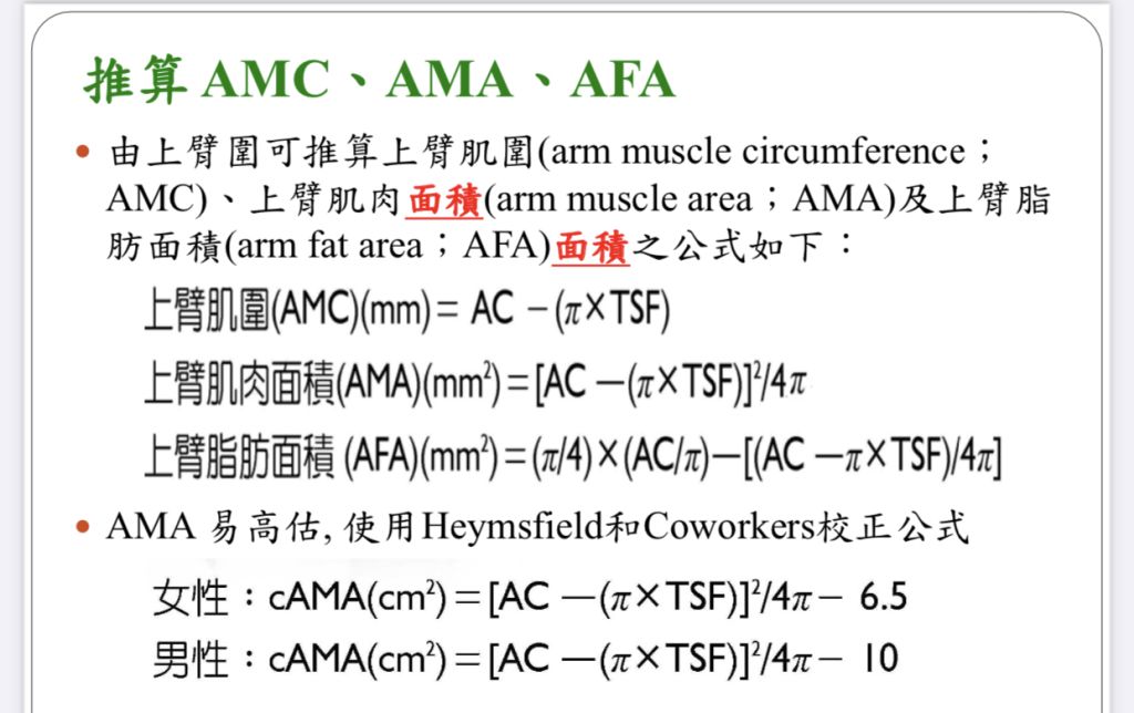 (A)上臂肌肉面積可由三頭肌皮下脂肪厚度(triceps skinfold measurement)和上臂圍(midarm circumference)換算而得