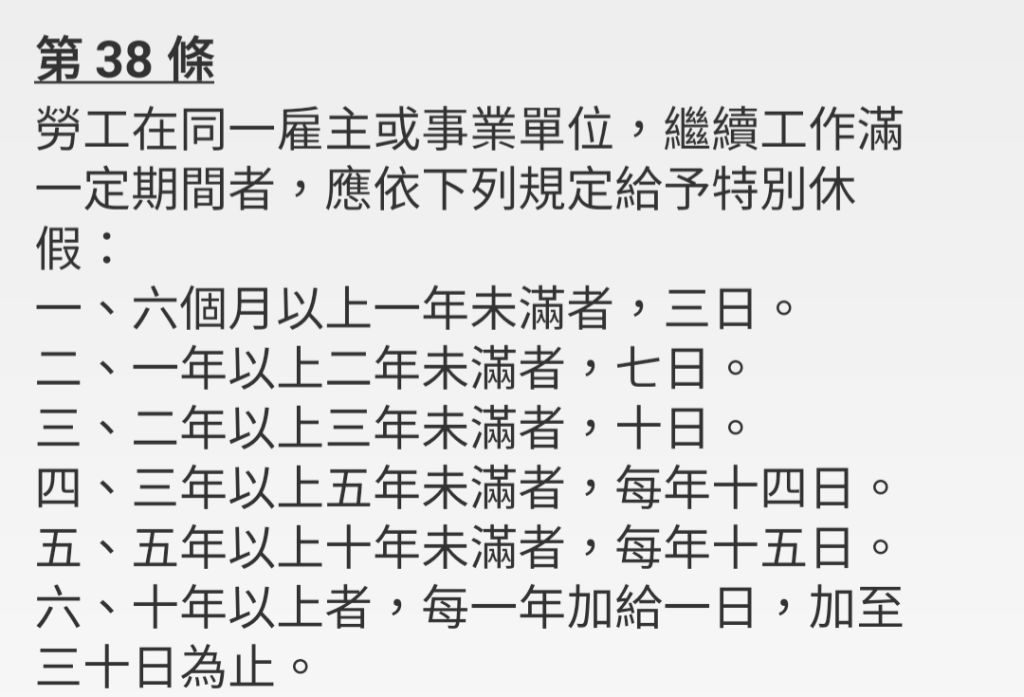 (A)在同一雇主繼續工作 1 年以上 2 年未滿者,特休 7 日