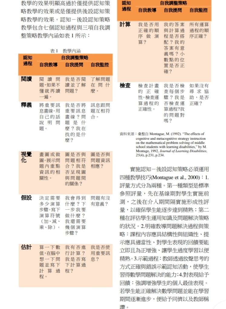 19. 在資源班教數學的周老師除了要學生按著特定五個步驟解文字題,每個步驟還同時要自我指導、自我提問和自我監控,請問周老師是
