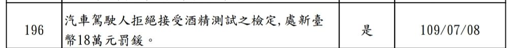 196 汽車駕駛人拒絕接受酒精測試之檢定,處新臺幣18萬元罰鍰。