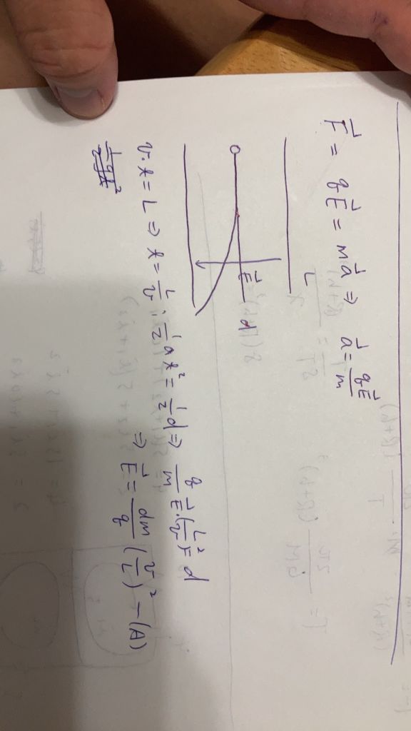 2. 一質量m 且電荷為q的墨滴,以速率v進入兩片帶電平行金屬板形成的均勻電場E 中,如圖所示。兩平行金屬板間距d,金屬板長度為L,墨滴由兩板正中央進入電場,若墨滴可順利通過帶電板的電場區域,不碰及任一帶電板,此區域的電場量值 最大為下列何者?