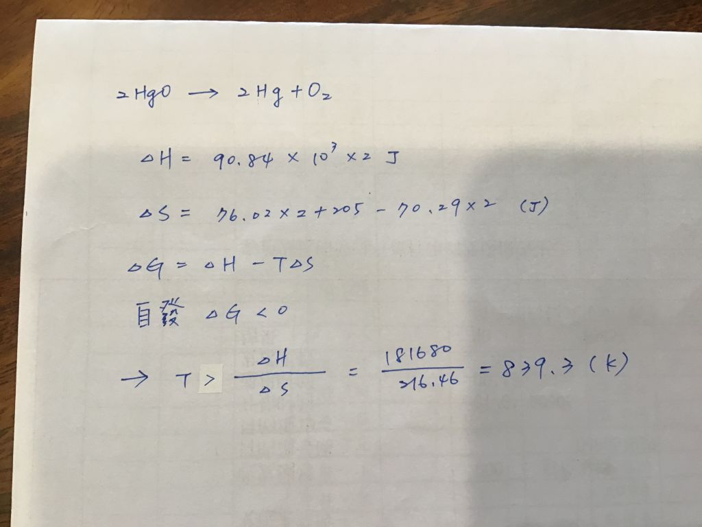 請根據此數據推算在標準狀態下發生可自發反應的溫度。