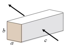 2. 有一塊導電材料,其 3 個周邊的尺寸分別為 a =10 cm,b =10 cm,c =30 cm 如下圖所示,電阻係數為 ρ = 0.005 m-Ω,則電流流經該導電材料的方向如圖示箭頭方向時,其電阻為多少?