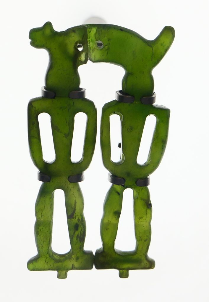 人獸形玉玦是利用透雕的手法,雕出兩個並立的人形,兩手插腰、雙腳分開,頭上頂著一個類似貓科動物的獸形,獸足和下面的人形共用頭部,型制十分特殊。此種特殊的造型,在海外各地十分罕見,可謂台灣獨有的玉器形式。