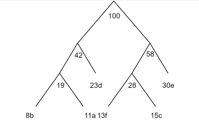 20 假設一文字檔案僅包含 a, b, c, d, e, f 六種字元,其出現頻率百分比分別為 11%, 8%, 15%, 23%, 30%, 13%。