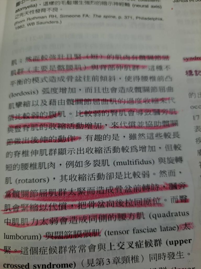 提到: 比較弱的臀肌會導致國旁肌與豎脊肌的收縮會增加,來代償並協助髖關節做出後伸的動作,有趣的是,雖然這些較長的脊椎伸肌顯示出收縮活動較為增加,但較短的腰椎肌肉,例如多裂肌(multifidus)與旋轉肌(rotators)其收縮活動是比較弱的