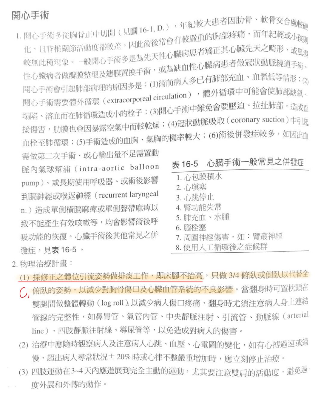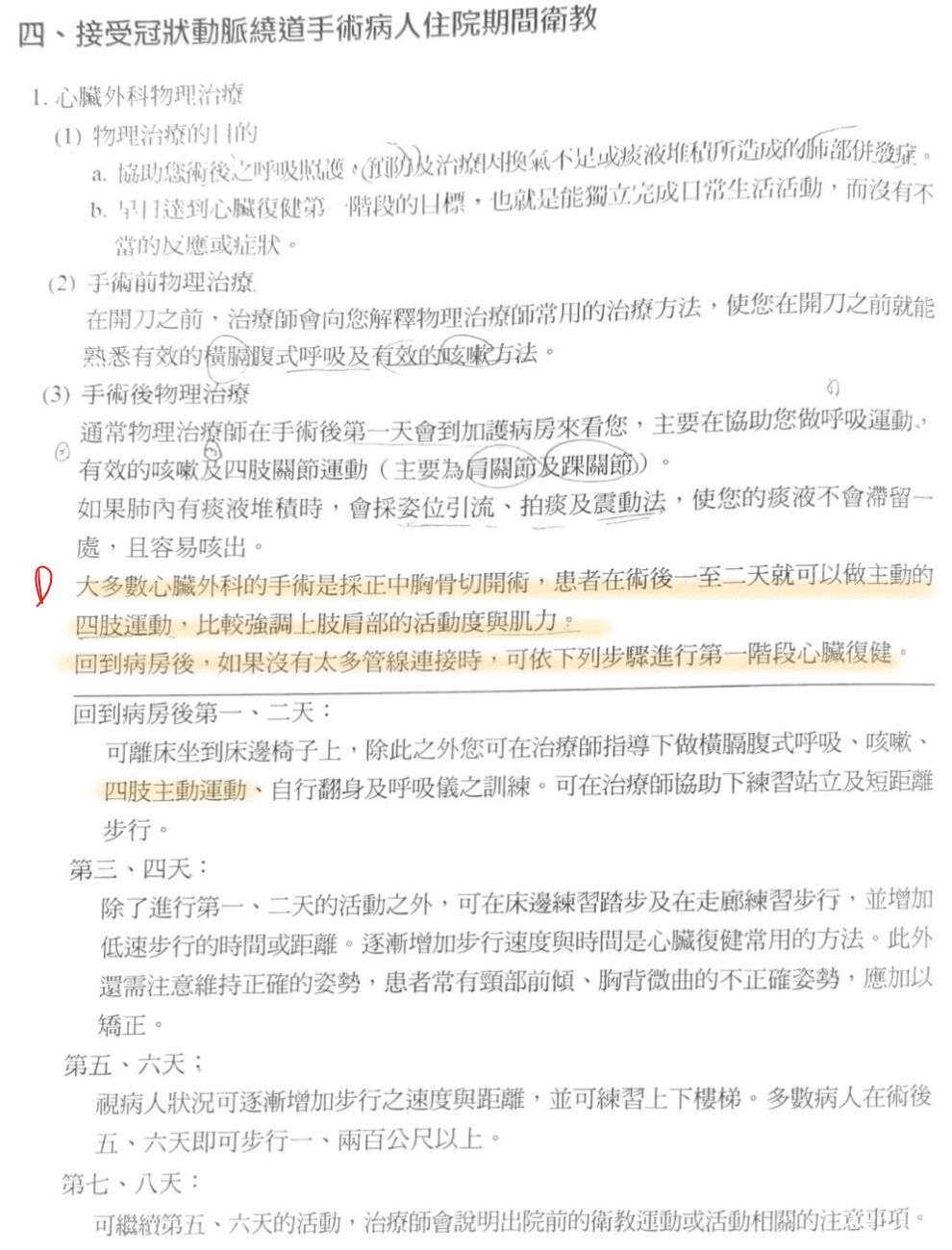 20.某患者的開心手術病歷報告中包含下列紀錄:「GSV1→OM2,LIMA→LAD」,則此患者的術後物理治療,
