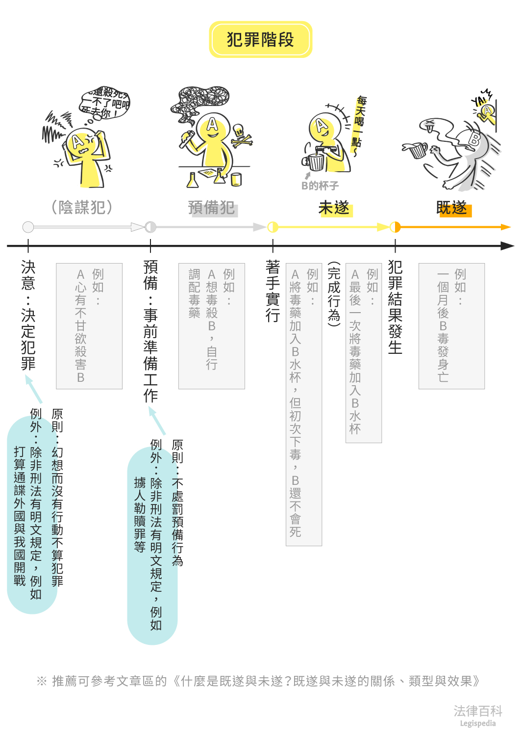 在本案例中,A女欲殺害B女,此一階段是殺人決意,刑法並不處罰。接著,A女自行調配毒藥,屬於殺人的預備行為,刑法第271條第3項設有特別規定,A女成立預備犯。完成研發後,A女連續數日將毒藥加入B女的水杯內,已是著手犯罪的實行,而最後一次的下毒行為是屬於完成行為的階段,一個月後B女死亡才算是發生結果,此時因A女已著手、B女死亡,因此本案A女成立刑法第271條第1項的殺人既遂罪。相反的,B女若未喝下已遭下毒的水,表示殺人結果並未發生,A女僅成立刑法第271條第2項的殺人未遂罪[6]。